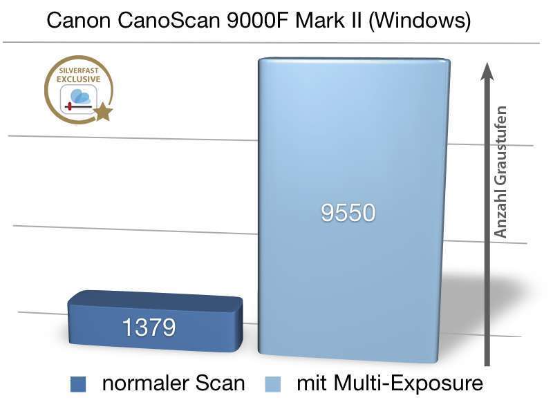 Noch wichtiger ist, dass der preiswerte CanoScan 9000F Mk II von SilverFast mit der Multi-Exposure-Funktion derart manipuliert werden kann, dass sein Dynamikumfang von 1379 Graustufen auf 9550 erhöht wird. […] Sie sollten nicht versuchen, Staub und Kratzer mit Photoshop zu entfernen, sondern mit SilverFast und dessen iSRD-Funktion. iSRD verwendet die Infrarotlampe Ihres CanoScan 9000F MK II um Staub und Kratzern zu erkennen und automatisch zu entfernen (und das viel schneller als „ICE“, das Sie bei einigen anderen Scannern finden).
