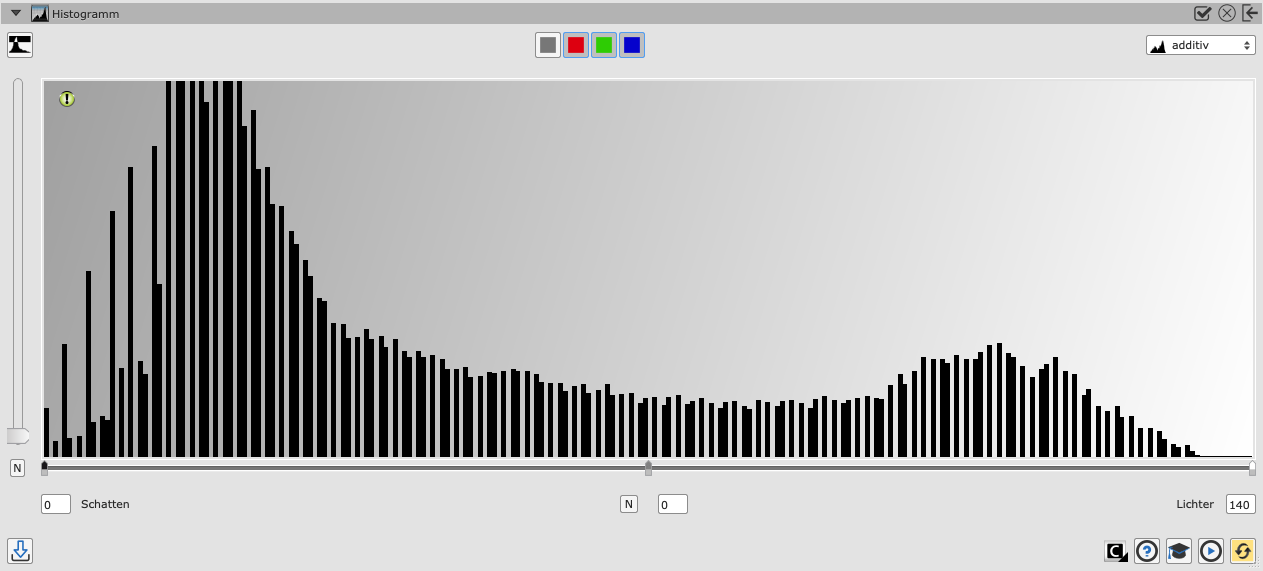 Das normale Histogramm, die additive Darstellung enthält alle drei RGB-Kanäle und ermöglicht so eine schnelle Anpassung von Lichtern und Schatten.
