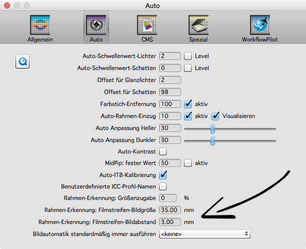 Sie können zusätzlich auch eine benutzerdefinierte Bildgröße erzwingen. Geben Sie dazu darunter bei „Rahmen-Erkennung: Filmstreifen-Bildgröße“ die gewünschte Breite der Rahmen für Ihre Filmstreifen in mm ein. Benötigen Sie einen speziellen fixen Abstand zwischen den einzelnen Bildern, nutzen Sie die Einstellung „Rahmen-Erkennung: Filmstreifen-Bildabstand“.