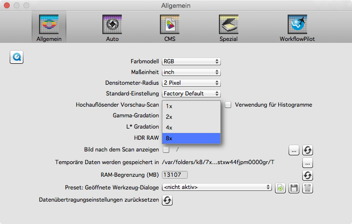 Je mehr Bilddaten dem Algorithmus zur Rahmenfindung zur Verfügung stehen, desto genau können die Bildrahmen gefunden werden. Wählen Sie in den SilverFast-Einstellungen im Reiter „Allgemein“ im Dropdown-Menü „Hochauflösender Vorschau-Scan“ die Einstellung „8x“ aus, um die Leistung der IFF+Engine zu maximieren.
