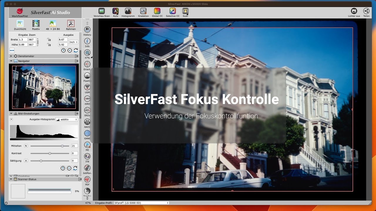 Wenn die Vorlagen hundertprozentig flach auf dem Scanner liegen, ist eine Fokus-Kontrolle nicht unbedingt erforderlich. Doch werden Filmhalter eingesetzt, heben diese die Vorlagen leicht an. Auch sind Diarahmen häufig von unterschiedlicher Rahmendicke und Filmstreifen selten ganz eben, sodass der Fokus von Rahmen zu Rahmen variieren kann. Ist der Fokus richtig eingestellt, erhält man klare und scharfe Bilder.