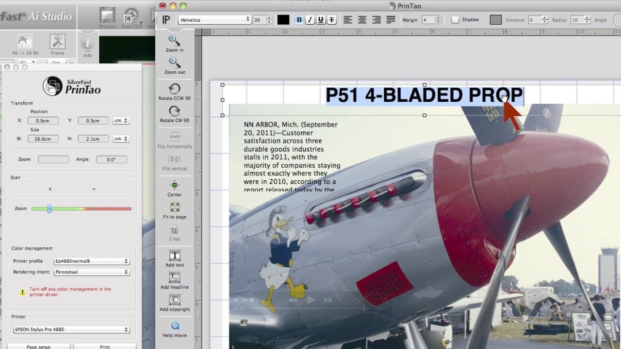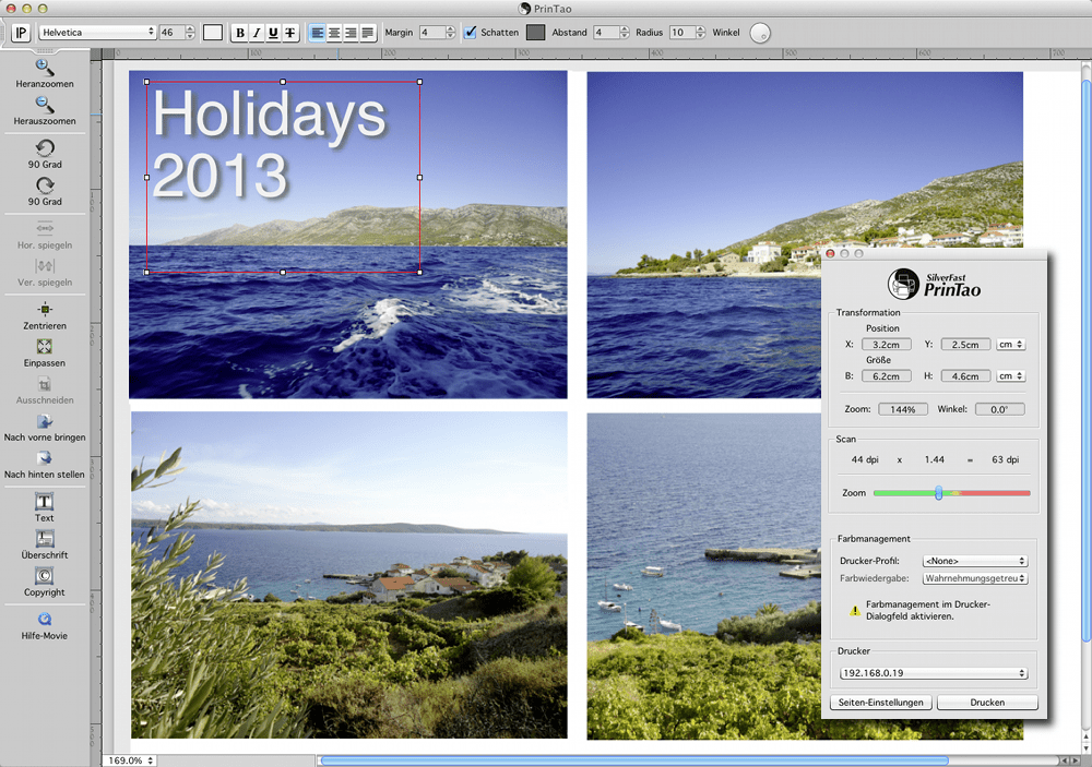 Mit den umfangreichen Text-Werkzeugen lassen sich der Druckvorlage die verschiedensten Beschriftungen hinzufügen. Der farbige Schieberegler im zweiten Fenster warnt vor ungenügender Auflösung. Hier werden ebenfalls Einstellungen zum Farbmanagement getroffen und abschließend startet ein Klick auf „Drucken“ zunächst den Scan, bzw. die HDR-Bearbeitung und anschließend den Druck Ihrer Bilder.