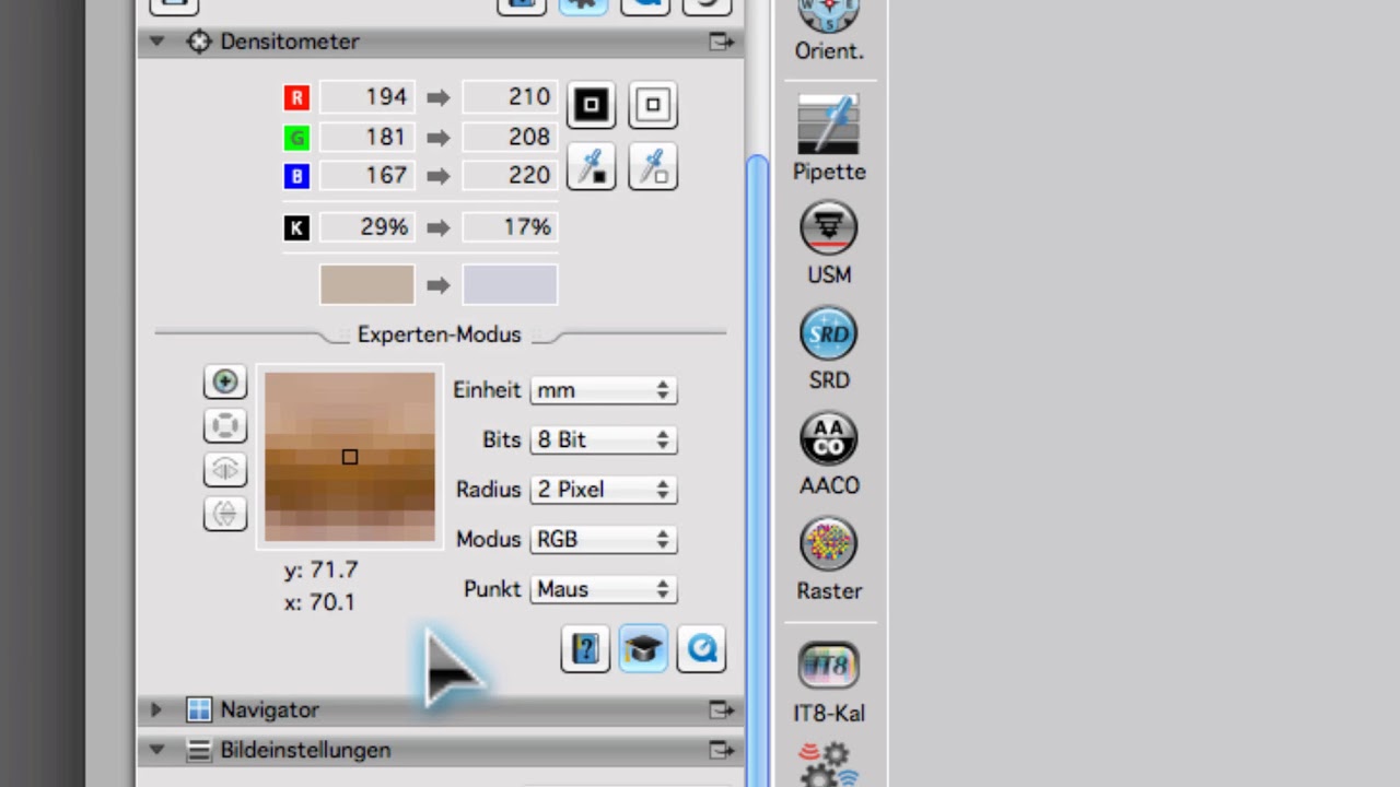 Contrairement à un spectrophotomètre, un densitomètre peut seulement mesurer les valeurs tonales et non les teintes de couleur. Analoguement, le densitomètre dans SilverFast 8 est un outil logiciel qui contrôle toutes variation de valeurs de gris et de couleur de manière très précise. Grâce au densitomètre le changement de la valeur tonale est facilement compréhensible pour chaque pixel individuel de l’image suite à l’optimisation d’image.