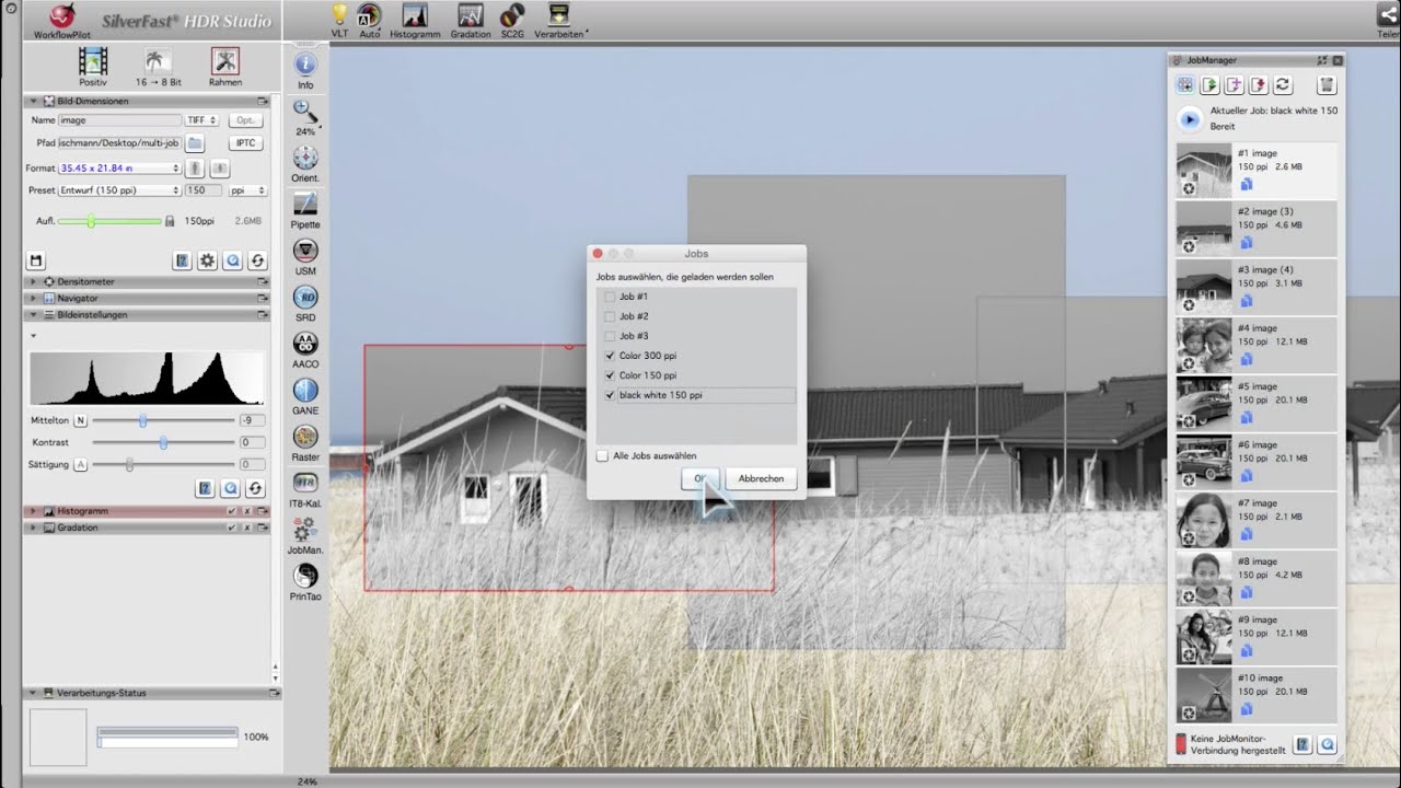 Pour optimiser ultérieurement l’image et pour traiter les données brutes, les numérisations sont archivées sur le disque dur en utilisant le format DNG ou HDR(i). C’est une tâche simple et efficace. Il est également possible d’optimiser les images lors de la numérisation. Ici aussi, le JobManager est une bonne aide, les paramètres d’optimisation peuvent être transférés sur d’autres images.
