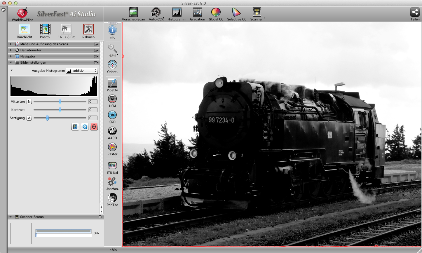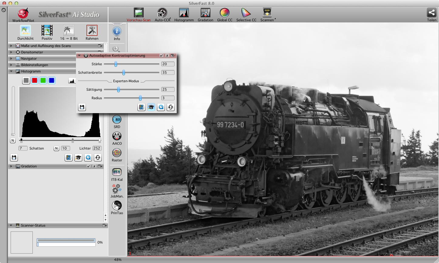 SilverFast AACO arbeitet automatisch, sobald die Funktion aktiviert wird. Durch Ein- und Ausschalten mit dem Häkchen im Werkzeug-Dock kann der Effekt im Vorschau-Fenster gut beobachtet werden.
