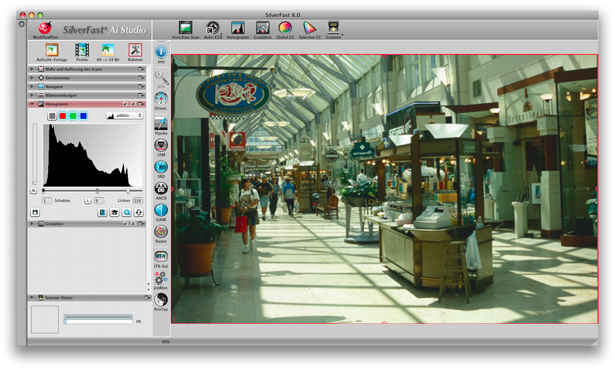 Die Bildautomatik ist eines der nützlichsten SilverFast-Werkzeuge. Per Mausklick wird das Bild automatisch hinsichtlich Lichter, Tiefen und Mitten optimiert. Auch Farbstiche werden automatisch entfernt. Diese einfach anzuwendende Bildkorrektur kann als solide Basis-Optimierung für alle weiteren Bearbeitungsschritte angesehen werden.