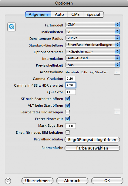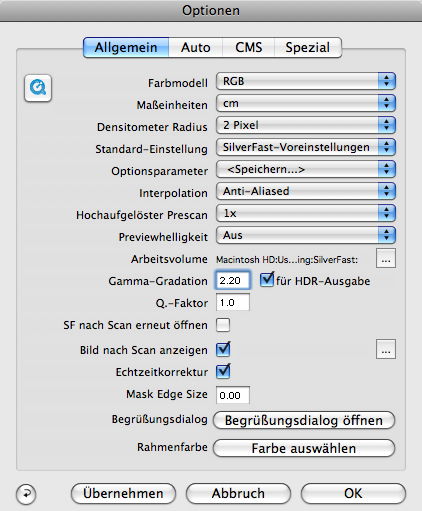 Der Vorteil der Gamma-Synchronisation mit 48Bit-Daten ist die konsistente und vorhersagbare Helligkeits- und Farbwiedergabe zwischen SilverFast Ai und SilverFast HDR (trifft auch für die DCPro- und Studio-Versionen zu). Wurde beim Scannen die Gamma-Synchronisation aktiviert, muss in SilverFast HDR kein Gamma-Wert von Hand eingestellt werden. SilverFast HDR erkennt diesen automatisch aus der gescannten Datei und trägt ihn im Options-Dialog ein.