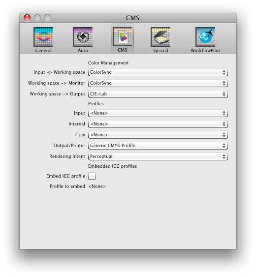- Choose 'CIE-Lab' from the 'Working space -> Output' menu.