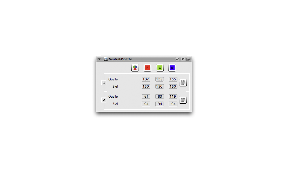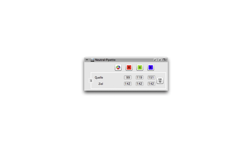 Ein Mausklick auf das Icon "Pipette" in der vertikalen Werkzeugleiste öffnet ein Dropdown-Menü. Mit Auswahl des Eintrages "Neutralpunkt" verwandelt sich der Mauszeiger in ein Pipettensymbol. Durch Mausklick auf eine Farbfläche des Bildes, die neutral erscheinen soll, wird die Farbkorrektur automatisch durchgeführt. Die genaue Änderung der Farbwerte an diesem Punkt, lässt sich im Werkzeug-Dialog "Neutral-Pipette" einsehen. Der Neutral-Punkt kann jederzeit gelöscht und neu gesetzt werden.