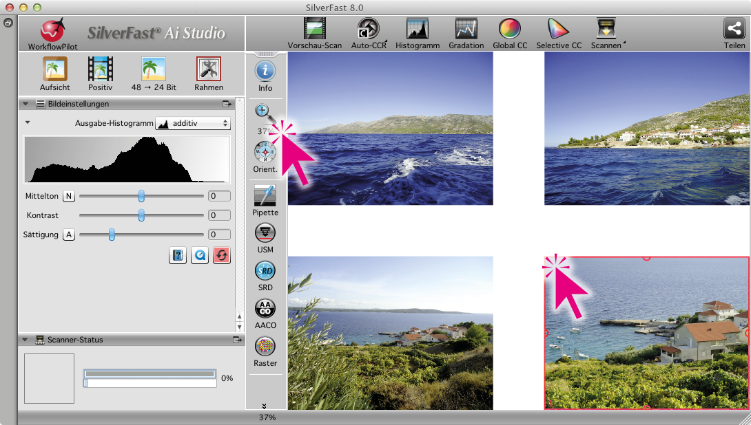 - normale Vorschau: SilverFast zeigt den gesamten Vorschau-Scan in der Übersicht. Werkzeug-Einstellungen und Effekte werden näherungsweise angezeigt. Mit Klick auf das Lupen-Symbol werden einzelne Scan-Rahmen bildschirmfüllend vergrößert.