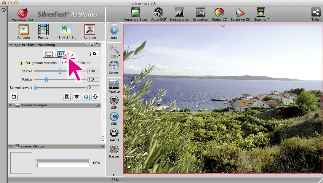 Einige Werkzeuge, wie beispielsweise USM und iSRD, besitzen die sogenannte 1:1-Vorschau. Mit Klick auf den "1:1"-Button wird ein Bildausschnitt mit der für den späteren Scan im Dialog "Maße und Auflösung des Scans" eingestellten Auflösung gescannt. Ein Pixel auf dem Monitor entspricht nun genau einem Pixel des Scans. So lassen sich die Werkzeug-Effekte in der Vorschau besonders gut bewerten.