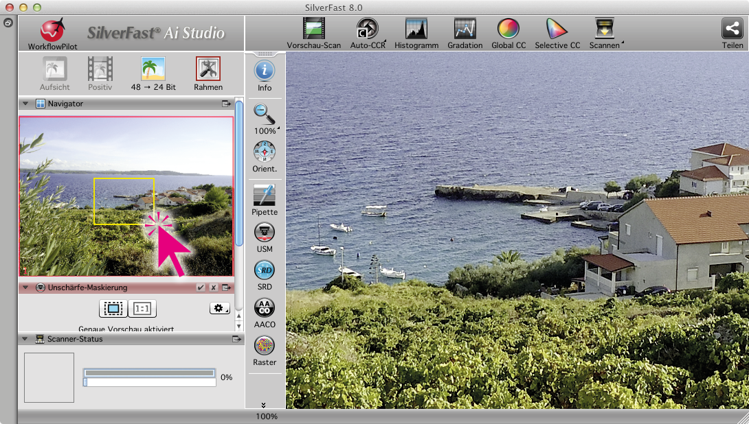 - 1:1-Vorschau: Zur exakten Einschätzung der Wirkweise eines Tools, wie beispielsweise iSRD, wird ein besonders hochauflösender Vorschau-Scan angefertigt. Im Navigator-Fenster wird mit dem gelben Rahmen ein kleiner Bildausschnitt gewählt, für den die aktiven Werkzeuge berechnet werden. Das Verschieben des Ausschnittes erfordert stets eine Neuberechnung der Werkzeug-Effekte.