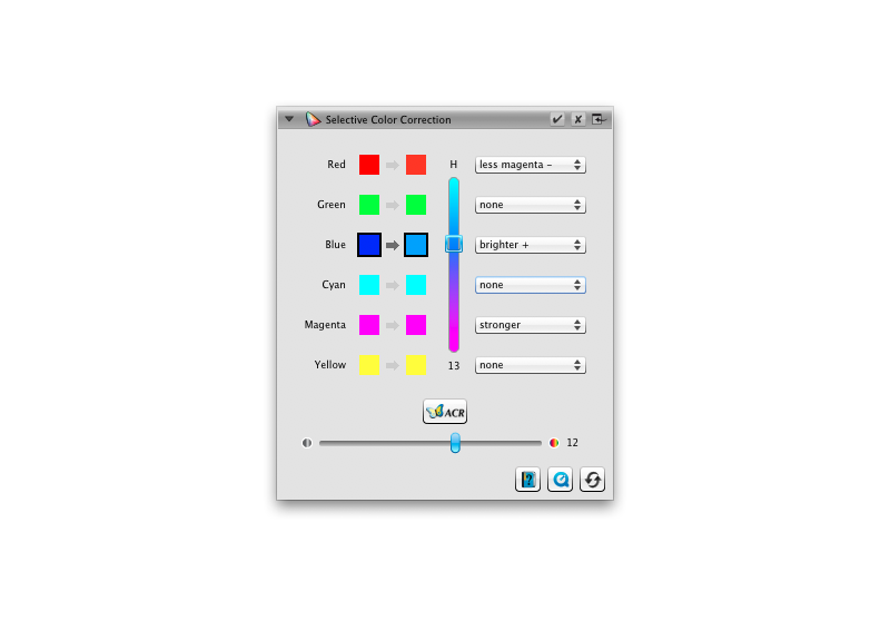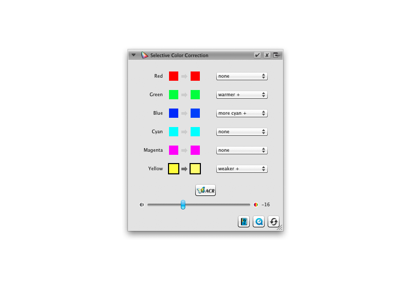 If the overall color balance of a picture should not be changed, but rather just a single color adjusted, Selective Color Correction (SCC) is used. Use of Selective Color Correction is especially practical when one color is contaminated with traces of another. The tool provides access to the six base colors red, green, blue, cyan, magenta, and yellow. For each of these colors there is a menu with preconfigured adjustments and a slider that can be used to change the color value. The color value slider offsets the selected color to one of its neighboring colors on the color circle, that is, for example, red to yellow or magenta, or cyan to green or blue.