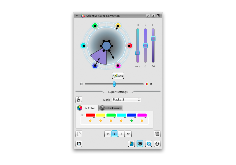 The secret of this tool lies in the immediate "recognition" of the selected color nuance and a practical palette composed of 6 or 12 base color variations that can be selected with continuous blending. The entire color palette is available. For more complicated cases, it is also possible to use scalable vector masks on freely defined areas. This permits up to 4 levels – independently from each other – to be subjected to complex color corrections of the same color with different color changes.