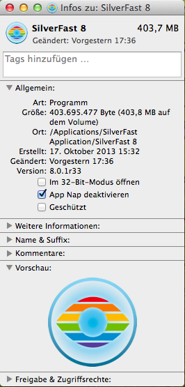 Führen Sie im Installationsordner einen Rechts-Klick auf die SilverFast 8 app aus und wählen Sie im Kontextmenü Informationen.