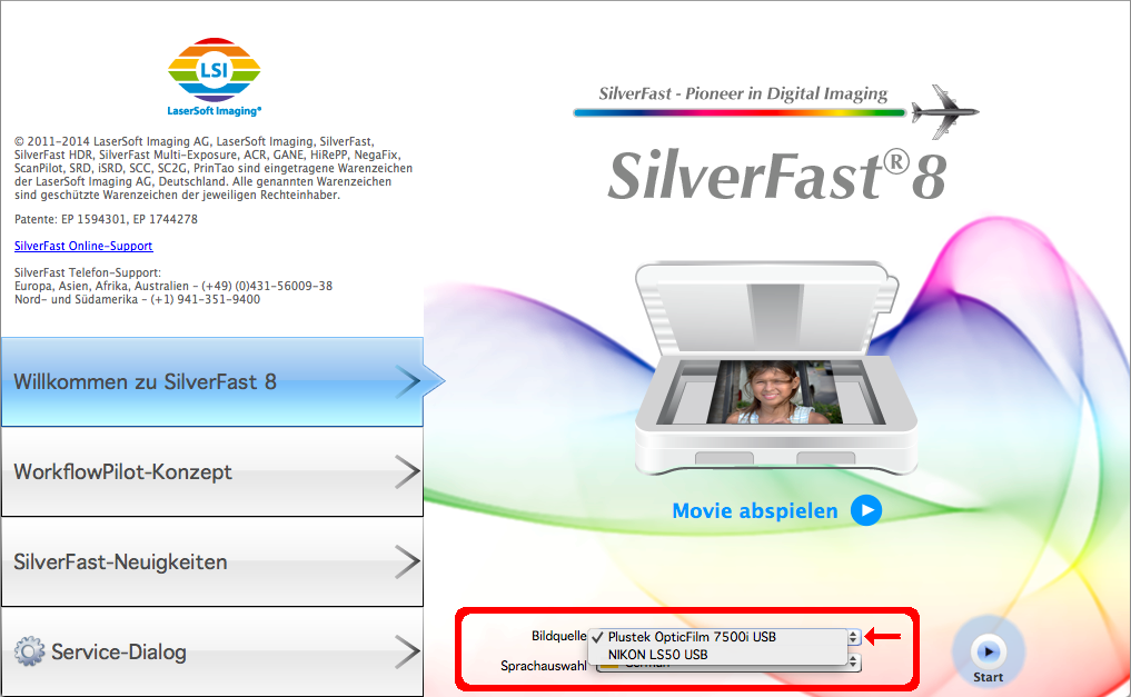 SilverFast wird auf jeden Scanner individuell angepasst. Daher muss für jeden Scanner das passende Modul installiert sein. Sie können Ihren Scanner über die Bildquelle, im Willkommen Fenster, auswählen. Sie finden das Auswahlmenü gleich neben dem Start Knopf.