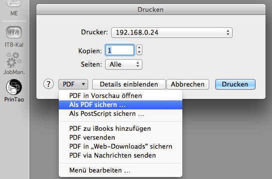 -> Wählen Sie einen beliebigen installierten Drucker ->Öffnen Sie das PDF Menü in der unteren linken Ecke -> Wählen Sie "Als PDF sichern ..."