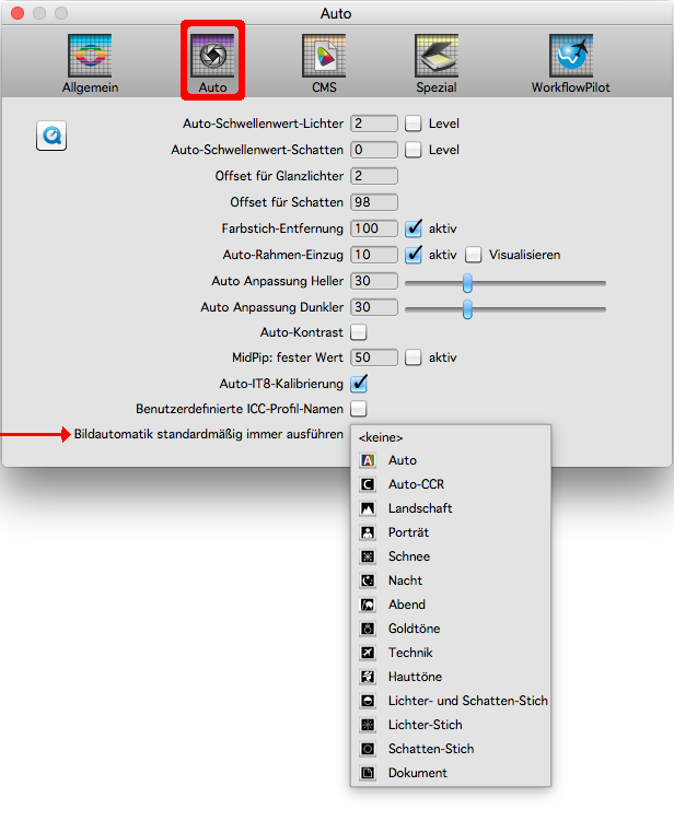 Die Bildautomatik für den Stapelbetrieb kann in den SilverFast Einstellungen im Auto Tab ausgewählt werden.