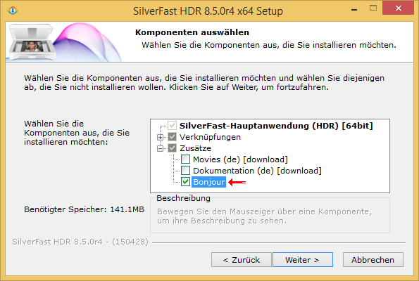 Apple Bonjour kann über iTunes oder SilverFast installiert werden. Falls Sie dies noch nicht getan haben, führen Sie das neuste SilverFast Update erneut aus und wählen Sie unter Zusätze den Punkt Bonjour aus.