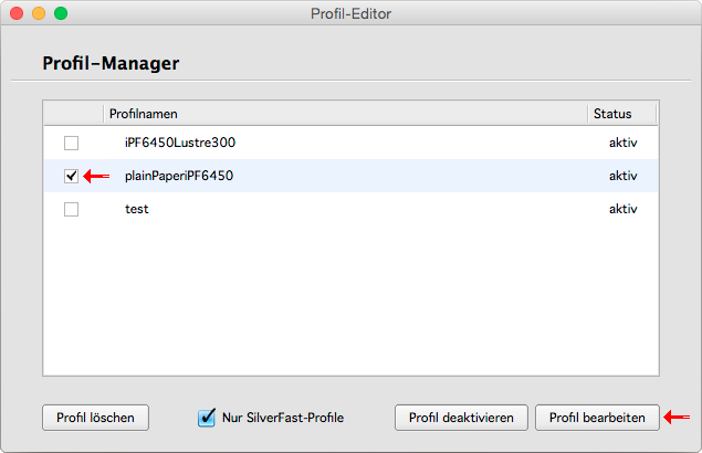 Zuerst wählen Sie das zu editierende Druckerprofil aus. Die Auswahl zeigt zuerst einmal nur die mit SilverFast erstellten Profile an. Sie können aber alle installierten Druckerprofile anzeigen und editieren, indem Sie die Checkbox "Nur SilverFast-Profile" deaktivieren. Bitte beachten Sie, das es eine Vielzahl von Profilformaten und Profilierungsmethoden gibt. Sollten Sie ein Profil nicht editieren können kontaktieren Sie bitte unseren Support.