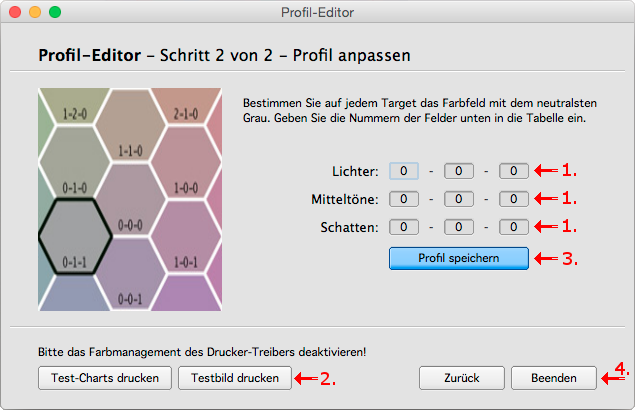 2. Die beiden Knöpfe unten links erlauben es Ihnen, Testbilder oder ein weiteres Neutrales Target, zu drucken. So können Sie Ihre Einstellungen direkt kontrollieren und gegebenenfalls weiter anpassen.