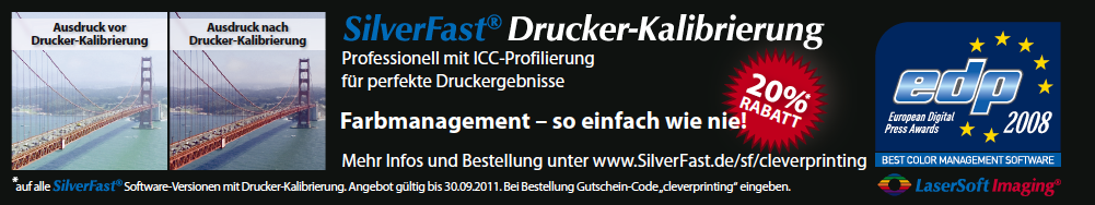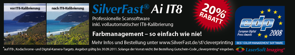 * Hinweis: Die Rabattaktion endet am 30.09.2011. Bis dahin erhalten Sie 20% Rabatt auf den regulären Preis aller IT8-, Digitalkamera- und Kodachrome-Targets (solange der Vorrat reicht), sowie auf den Preis aller SilverFast Scanner-Software-Versionen, die die ICC-Drucker-Kalibrierung enthalten. Um den Rabatt zu nutzen, geben Sie bitte am Ende der Bestellung im Online-Shop den Gutscheincode "cleverprinting" ein.