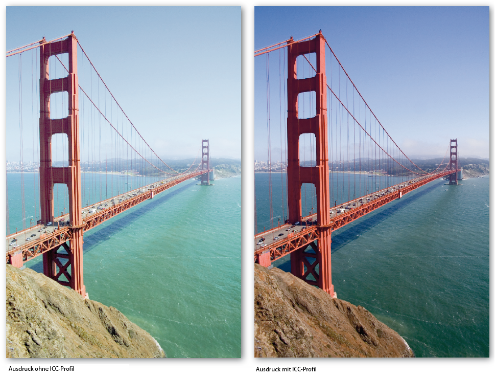 So wird gewährleistet, dass der Farbraum, den der Drucker wiedergeben kann, maximal und farbverbindlich ausgenutzt wird. Für gleichbleibende Qualität bei Materialwechsel kann für jede Kombination aus Drucker, Tintenart und Papiertyp ein eigenes ICC-Profil angelegt werden.