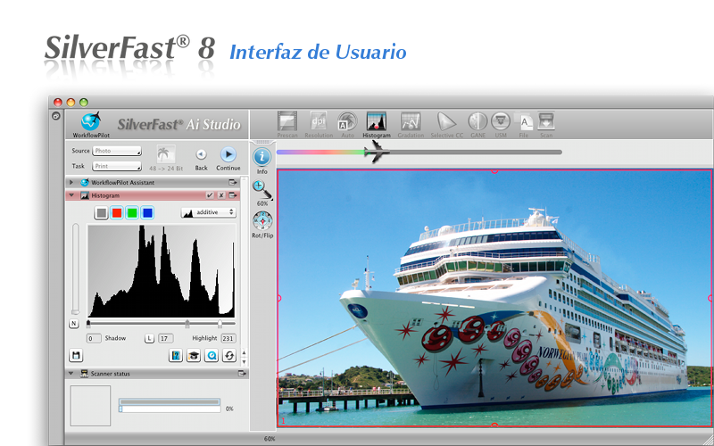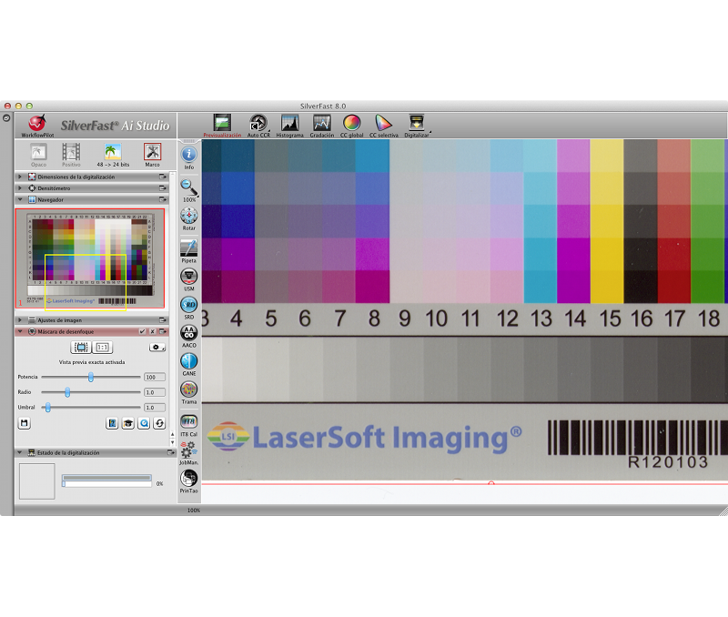 - Concepto de Vista Previa: SilverFast 8 muestra, en cualquier momento, una vista previa exacta del resultado final del escaneo en la ventana de vista previa. Incluso los resultados de optimización de imágenes complejas, tales como eliminación de polvo y arañazos con tecnología de infrarrojos iSRD y la máscara de nitidez USM, pueden estimarse con SilverFast 8. Las capacidades de la vista previa de SilverFast 6 estaban limitadas y no existía prácticamente vista previa para la herramienta de Multi-Exposure.