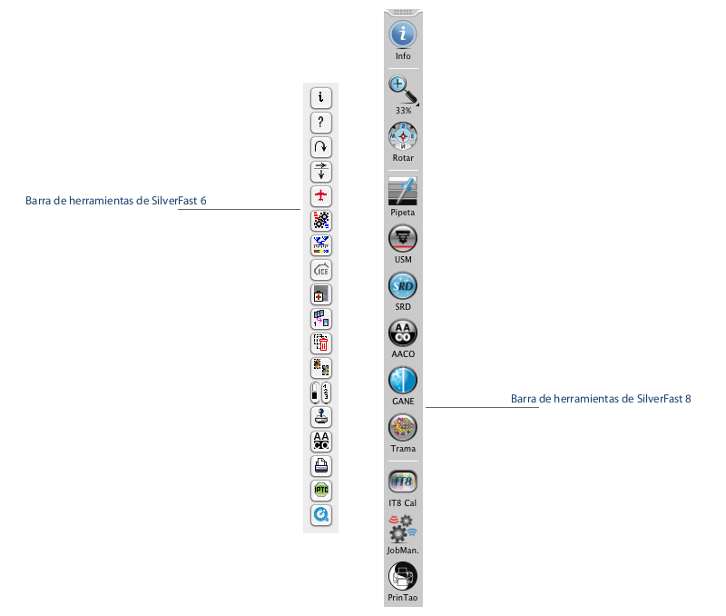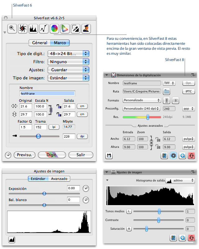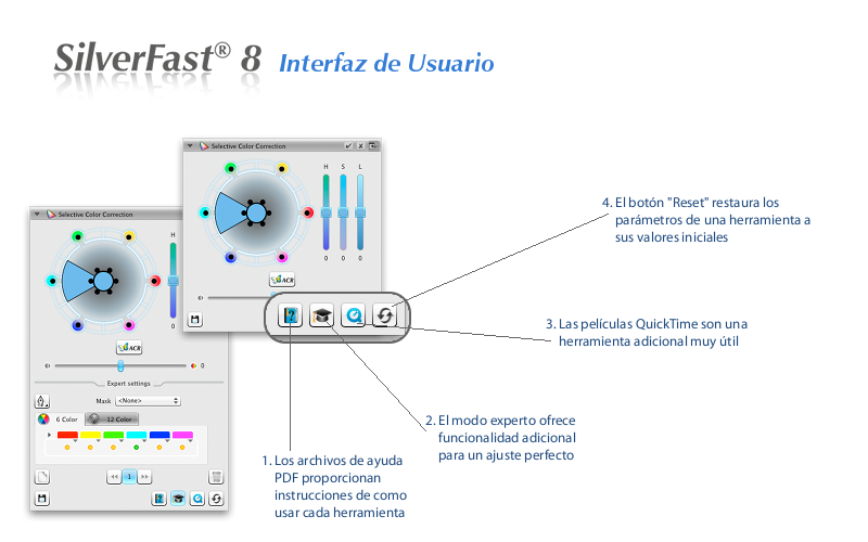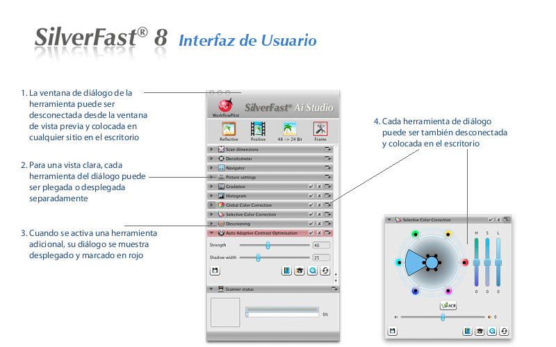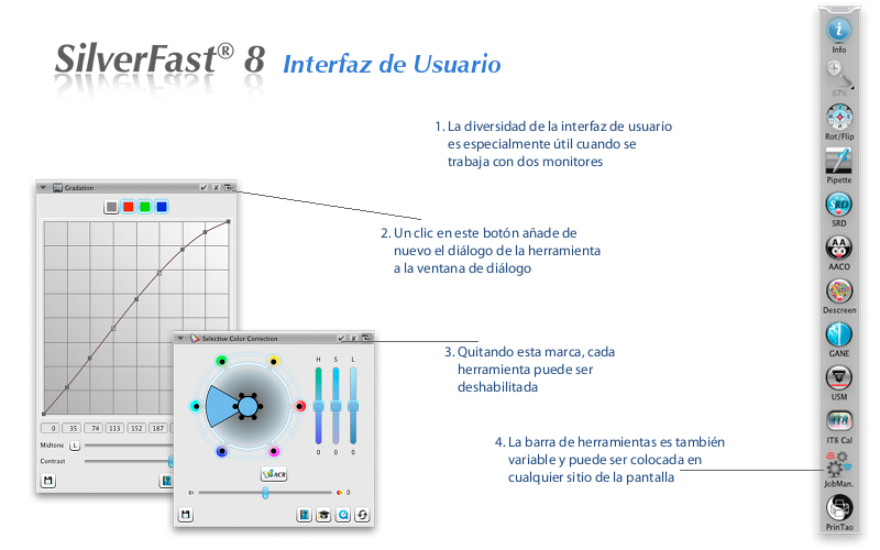- Mientras SilverFast 6 permitía abrir un solo cuadro de diálogo de herramientas, SilverFast 8 utiliza simultáneamente múltiples herramientas. Los cuadros de herramientas pueden ser desplazados libremente en el escritorio. Pequeñas ayudas sobre las herramientas y las películas de QuickTime le ayudan a familiarizarse con los nuevos cuadros de herramientas.