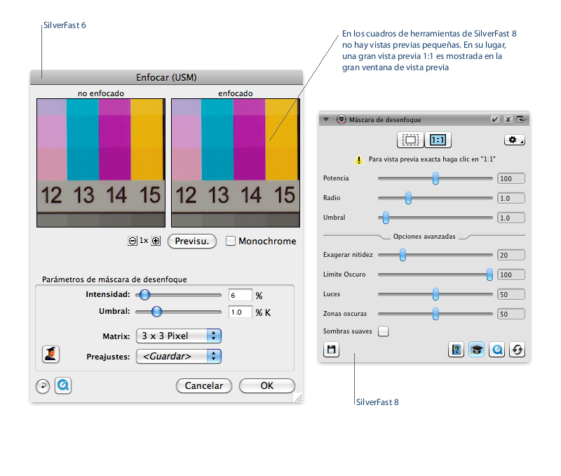 - Imagen 1: La vista previa 1:1 es esencial para una predicción precisa del efecto de herramientas como iSRD, USM. La ventana pequeña de vista previa de SilverFast 6 en estos cuadros de herramientas ya no está disponible en SilverFast 8, sin embargo …