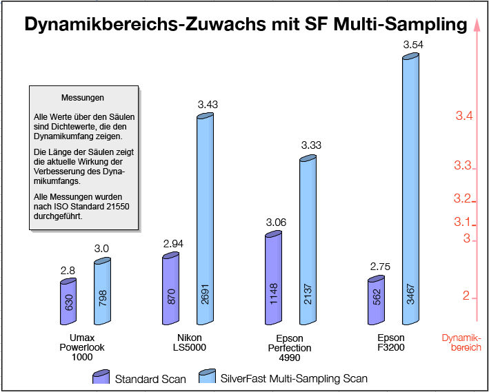 Wir haben die Dynamikbereichs-Zunahme nach dem neuen ISO Standard ISO 21550 gemessen und in dem nachstehenden Diagramm dargestellt. SilverFasts Multi-Sampling erzeugt dramatische Verbesserungen für den Dynamikbereich von Scannern. Lesen Sie mehr darüber wie der Dynamikbereich die Scannerqualität beeinflußt, was DMAX und Dichte bedeuten und wie der zum Patent angemeldete SilverFast Multi-Sampling Prozess arbeitet.