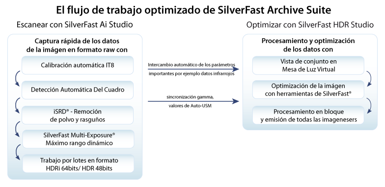 LaserSoft Imaging® presenta la solución única para archivar fácil y rápidamente diapositivas, negativos y reflectantes originales. Con el nuevo SilverFast Archive Suite usted obtiene un paquete con dos programas: SilverFast Ai Studio y SilverFast HDR Studio. Como ambos programas están equipados con funciones optimizadas, usted va a disfrutar de una velocidad de procesamiento máxima así como también de un flujo de trabajo eficiente. Un sistema de gestión de color integrado que cumple con los estándares profesionales completa el paquete.