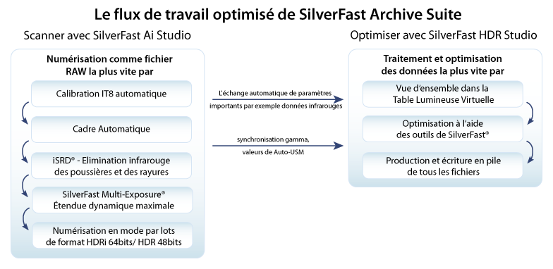 Grâce au logiciel pour scanner SilverFast Ai Studio vous générez des données brutes 64bits / 48 bits suivie d’une finition optimale dans SilverFast HDR Studio. Ces données brutes contiennent toutes les informations nécessaires de vos images et sont donc idéales pour l’optimisation ultérieure. L’Archive Suite est hautement adaptée pour l’utilisation professionnelle.