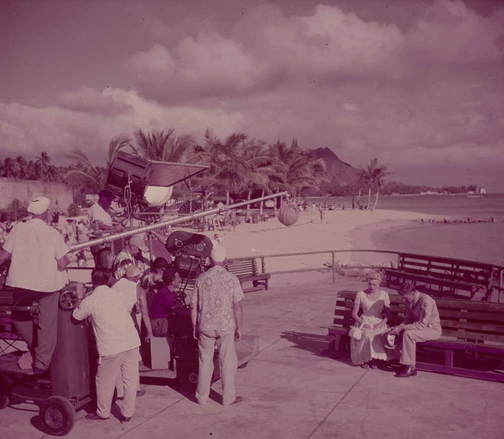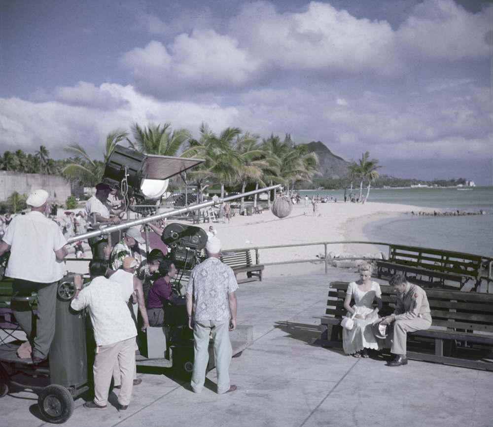 1953, sul set del film 'Da qui all’eternità', con Burt Lancaster e Deborah Kerr; foto originale non ritoccata (cliccare)