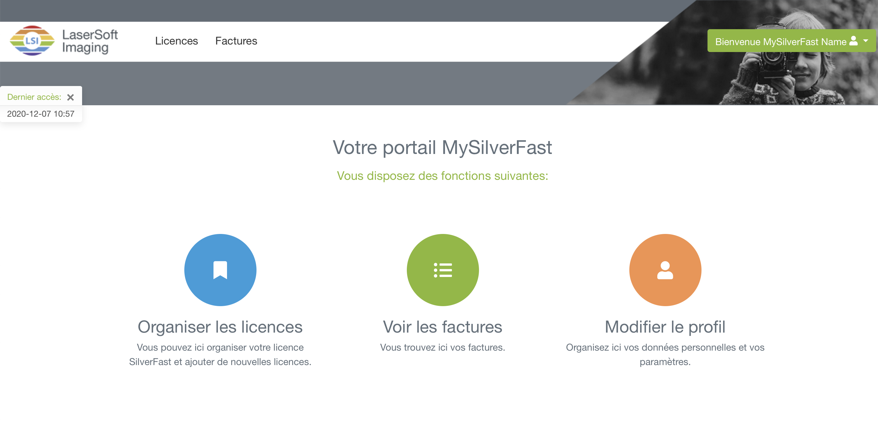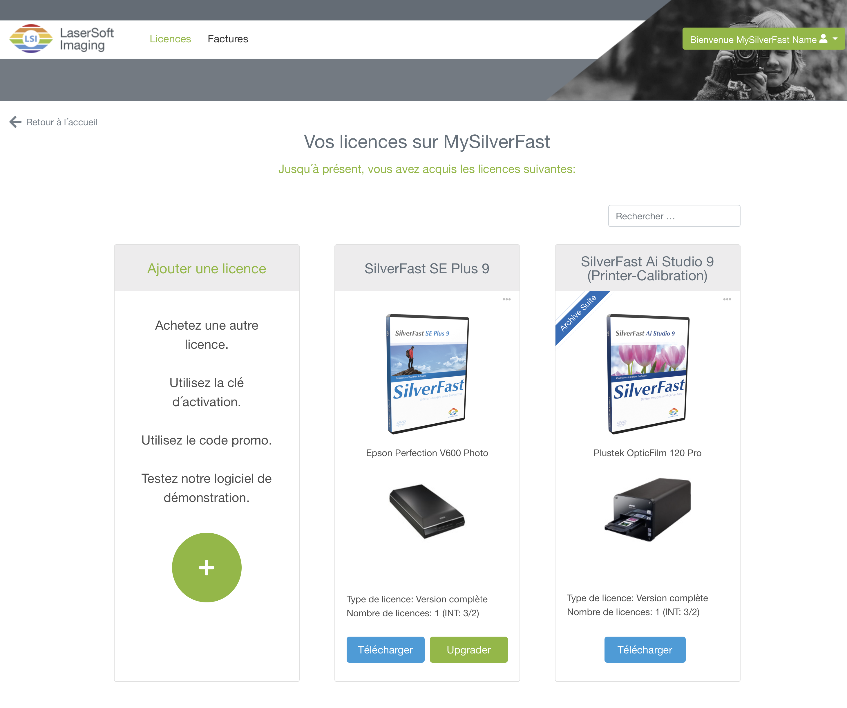 Gérez clairement vos licences dans le nouveau compte d'utilisateur MySilverFast. Désormais, il n'y a plus d'erreurs de frappe ou d’oublie de numéro de série.